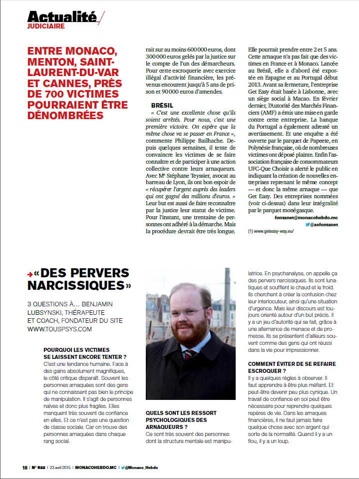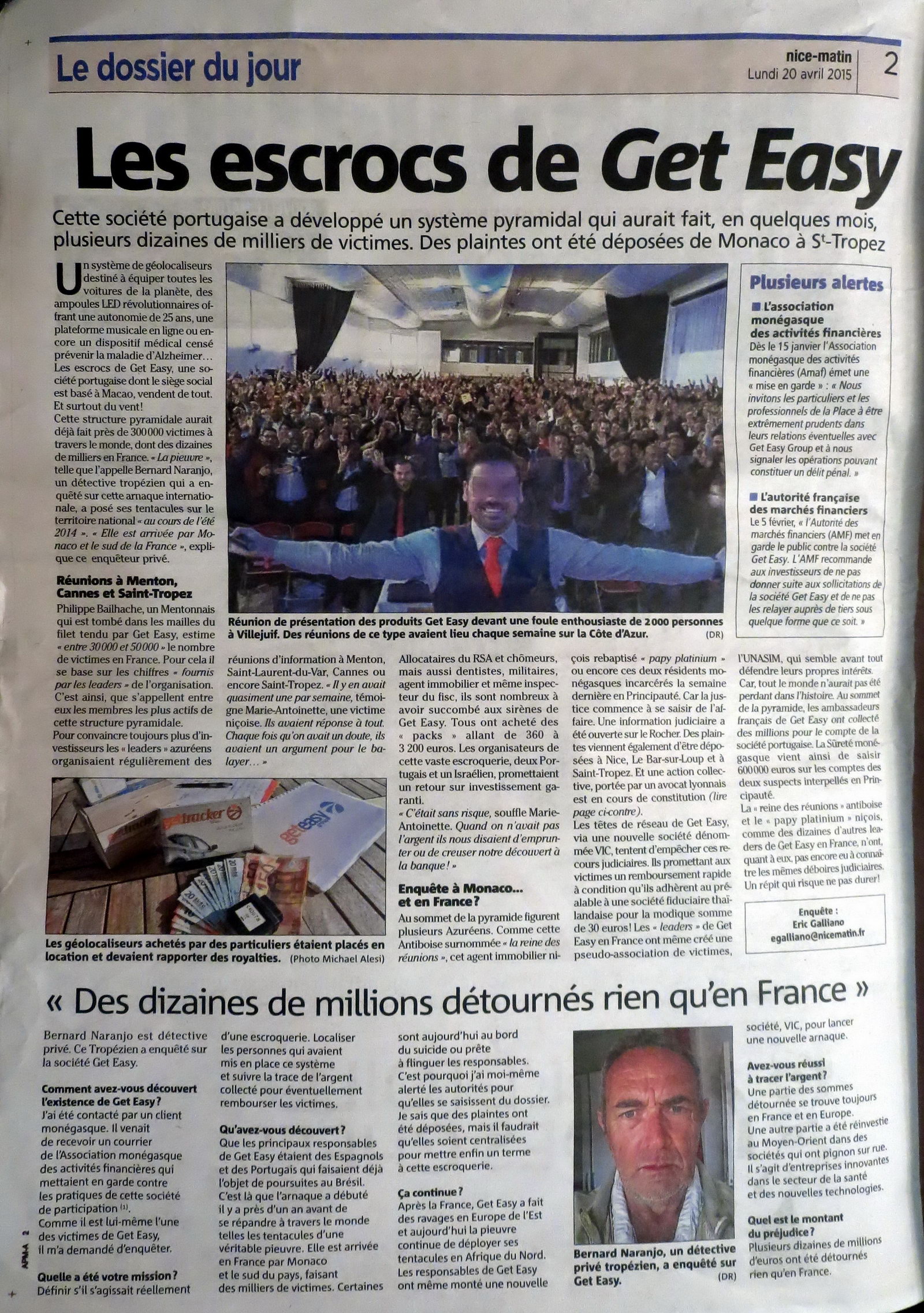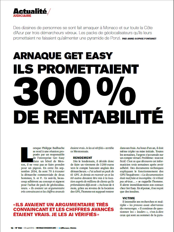 Tout d’abord je dois vous dire que j’ai moi-même été membre de GetEasy, avec un pack trackers à 3200€, au début j’y croyais à 1000%, juste après mon inscription j’ai parrainé deux membres de ma famille pour 3200 et 1200€. Heureusement 15 jours après mon inscription je suis tombé par hasard sur les premiers éléments compromettants qui m’ont poussé à approfondir mes recherches que je vous présente ici de façon détaillée. Le fait d’avoir été moi-même membre de cette escroquerie m’a permis d’obtenir des informations et de prendre conscience de certains éléments qui sont difficilement accessibles au gens "de l’extérieur". De plus j’ai eu accès aux groupes secrets Facebook par l’intermédiaires desquels les leaders transmettent les nouvelles des dirigeants aux membres.